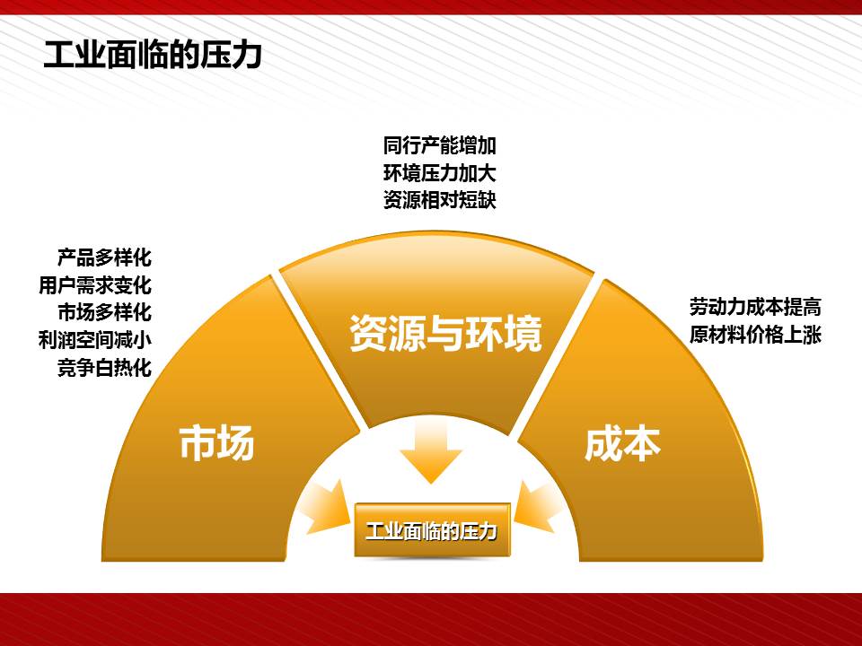 为什么说新工业革命正在发生?因为工业现在面临三大压力,一方面是市场白热化的竞争,用户需求多样化。成本的压力,不光是人力成本在上升,人口红利在消失,还包括原材料、土地。资源环境的制约。当前制造业从全球来讲都面临三大压力,致使传统的以能量转换工具为推动力的工具体系难以维系,传统的工业化发展模式现在走到尽头。