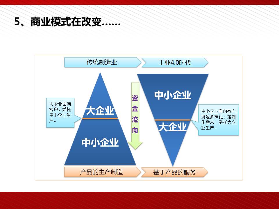 商业模式会发生巨大的改变,以前是大企业委托中小企业打工,未来应该是基于产品的服务,中小企业跟用户打交道,满足个性化、定制化不同的需求,让大企业组装制造,大企业提供平台,发展新经济就必须要考虑未来商业模式怎么变,怎么推动新经济的发展。