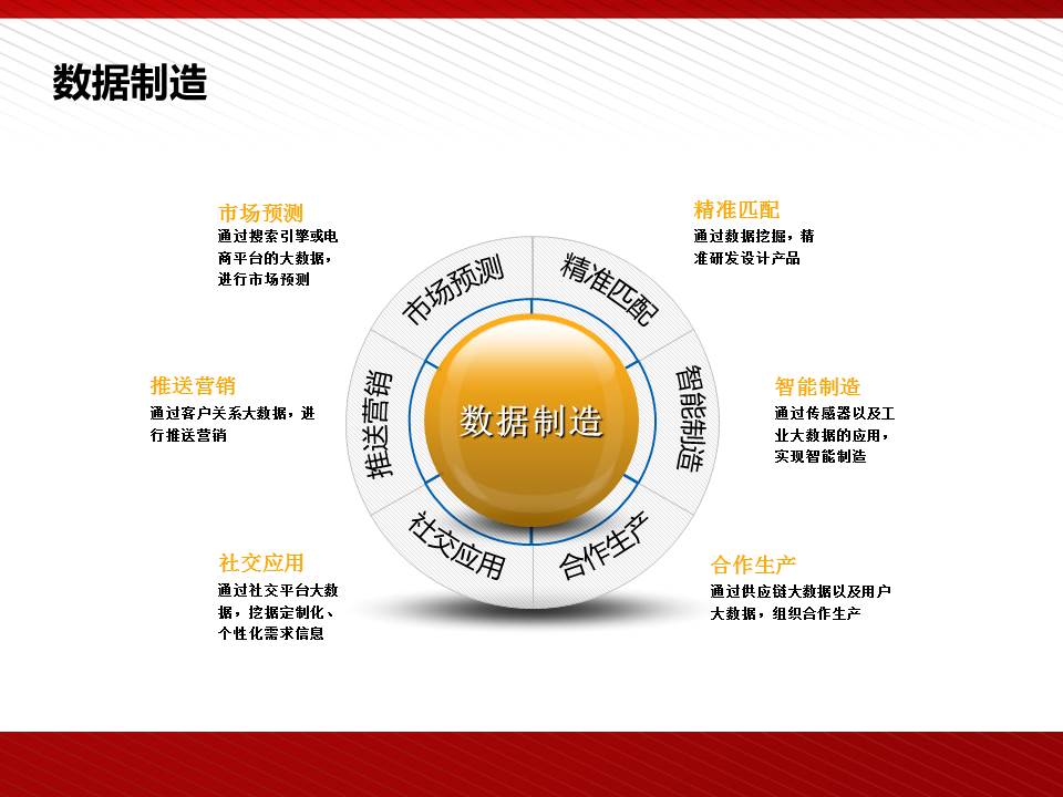 基于大数据的数据制造,让生产制造的各个环节都要用上大数据,比如市场预测,用到大数据之后,可能生产出来的产品不至于卖不出去,经过大数据搞预测比较精准,就不会造成产能过剩,精准的匹配,智能制造最后销售的时候也要用到大数据,客户针对大数据进行推送和营销,未来制造也是基于大数据的数据制造。