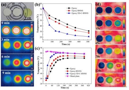 测试结果显示,该材料在低氮化硼纳米片含量(仅9.6 vol%)下,导热系数可提高约14倍,刷新了聚合物绝缘材料的导热增强效率记录。重要的是,这一纳米复合绝缘材料还保持了环氧树脂的优异绝缘性能,体积电阻率达1015 Ω cm。红外热像仪观察到该纳米复合绝缘材料具有比常规纳米复合材料快的多热响应速率,说明在热管理方面具有很好的应用前景。