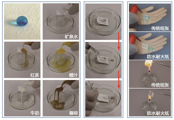 图:新型防水耐火纸对水和多种商业饮料都呈现出优良的稳定的超疏水性能和自清洁功能,其防水性能具有高稳定性,耐火纸即使受到物理损伤或在高温严酷环境中仍然能够很好地保持防水性能;防水耐火纸还表现出良好的隔热耐火性能。