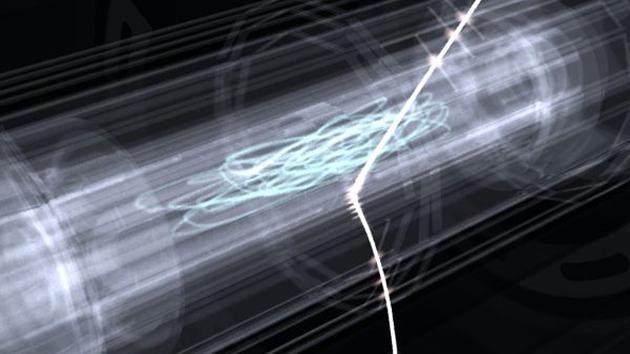 艺术想象图:被隔离起来的反氢原子。在“陷阱”中游荡了一段时间之后,反氢原子会被释放出来,用激光进行轰击,产生能够被附近探测器追踪的信号。