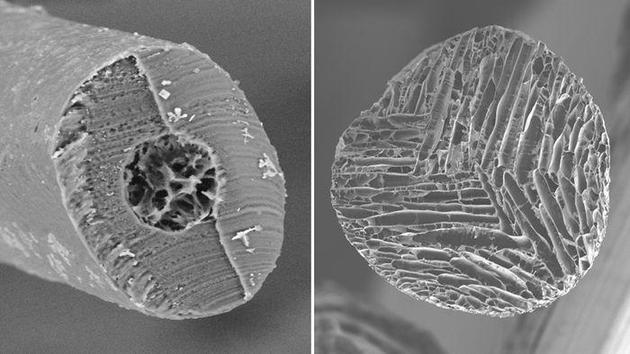 图:显微镜下的北极熊毛(左)和浙大的仿生有序多孔纤维(右)