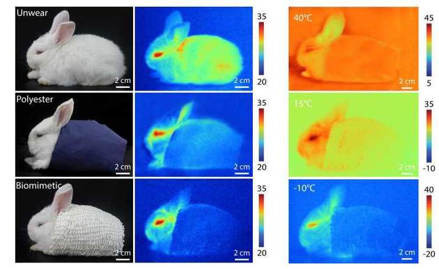 实验显示,在-10℃到40℃的环境中,红外相机几乎观测不到被仿生织物覆盖的生物体的热量,成功实现“隐身”。