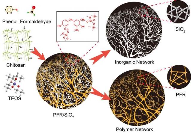 最近,中国科学技术大学俞书宏教授课题组以壳聚糖作三维软模板,发展了一种酚醛树脂(PFR)与SiO2共聚和纳米尺度相分离的合成新策略,成功研制了具有双网络结构的PFR/SiO2复合气凝胶材料。研究论文发表在Angew. Chem. Int. Ed.上,论文的第一作者是博士后于志龙。