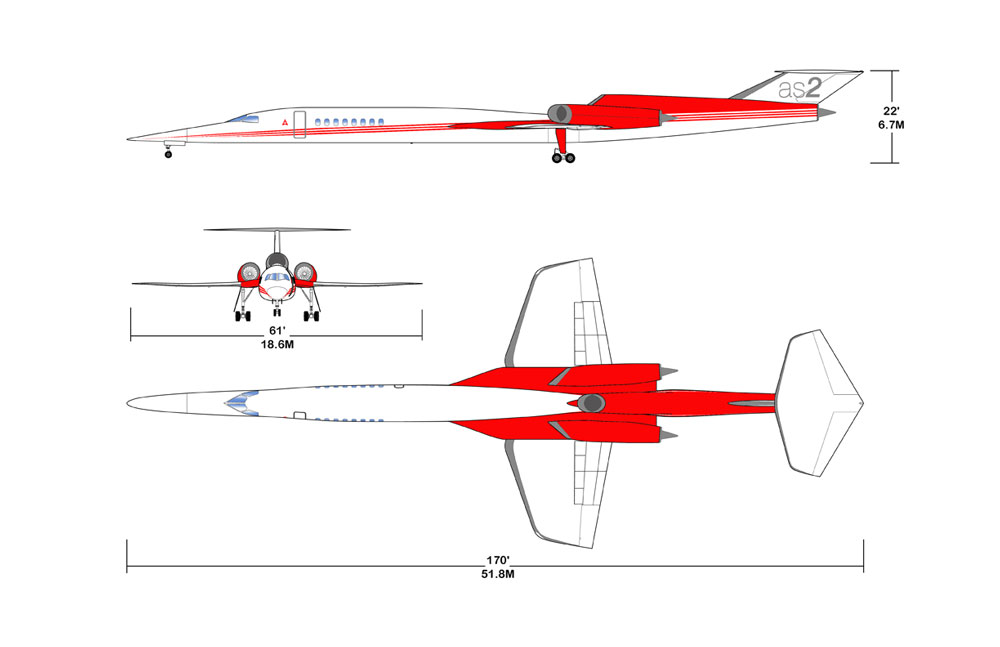 在传统的亚音速飞机上,翼展与机身长度大致相等。但是超音速公务机AS2的特点是短且薄的机翼和长的机身,很像一些超音速战机。该机翼能大大减少摩擦阻力,而且该机身能最大程度地减少波阻。除了与众不同的外观设计之外,AS2在其他方面都采用了常规设计,使用了最好的现代结构材料和组装技术,以及先进的推进系统,飞行控制系统等。