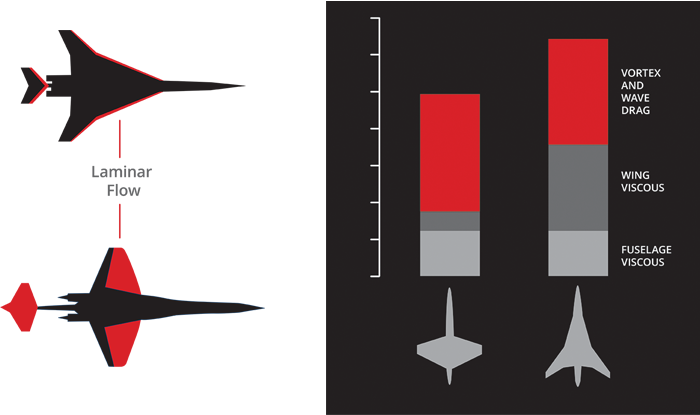 超音速飞行的传统解决方案一直是采用三角翼形状,这样气流的展向流动将导致边界层提前转捩,在翼尖处形成湍流流动。与传统三角翼飞机相比,超音速公务机AS2的机翼摩擦阻力降低很大,最终阻力降低20%。