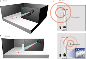 首先,他们朝自己试图看清楚的角落附近的地板发射了一束激光。激光从地面上反弹,产生仅有一些光子的球形“回声”。这通常很微弱,因此难以察觉,但拥有超敏感度的相机能发现它。
