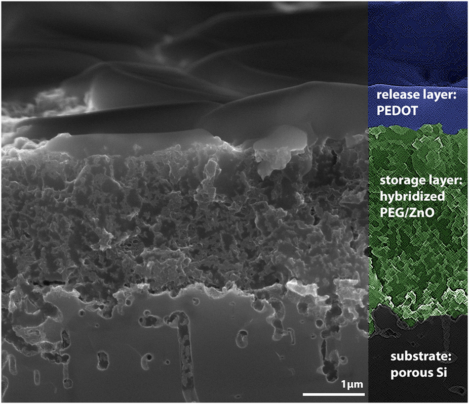 研究人员用原子层沉积的方法将氧化锌植入聚乙二醇薄膜中,形成了一种可水解的复合材料。这种材料薄膜厚度只有几微米,其分子结构适合储存相对大剂量的药物。为了让这种储药材料可以精确施放药物,其表面还被镀上了两层导电聚合物。